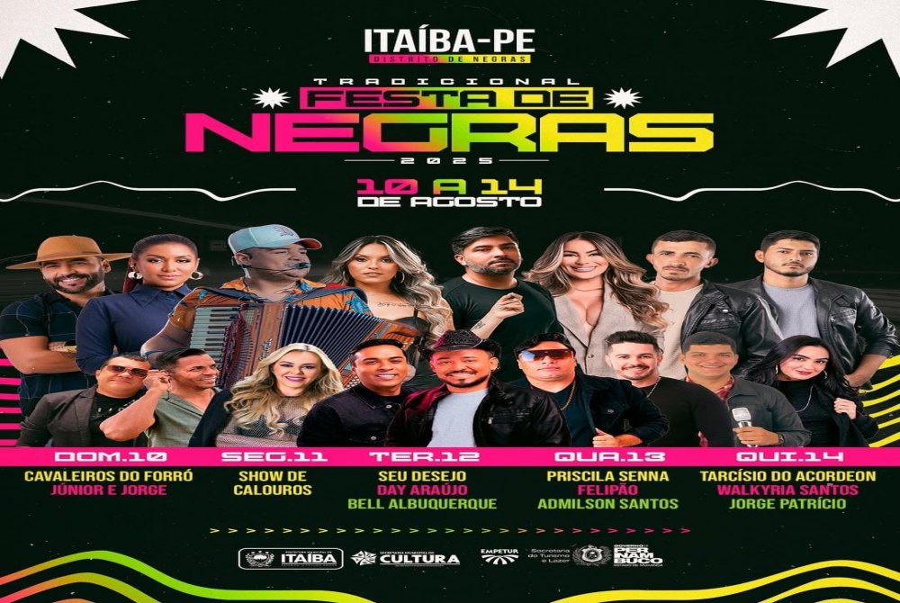 O Distrito de Negras, em Itaíba, Pernambuco, será palco de mais uma edição da Tradicional Festa de Negras, que promete agitar a região entre os dias 10 e 14 de agosto de 2025. A programação conta com grandes atrações musicais e apresentações que devem reunir um grande público durante cinco dias de festa.